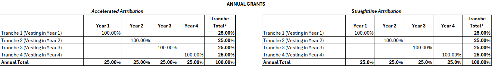 *Percentages shown for annual grants may be a little bit confusing. Let me explain. We wanted to illustrate the portion of total compensation expense recognized during each of the four years of the vesting schedule. However, for annual grants, the full amount (or 100%) is vested each single year. From the perspective of the four-year time horizon, the same amount comprises 25% of the total token compensation costs (assuming all other variables remain the same in each period, which is clearly an unrealistic assumption).